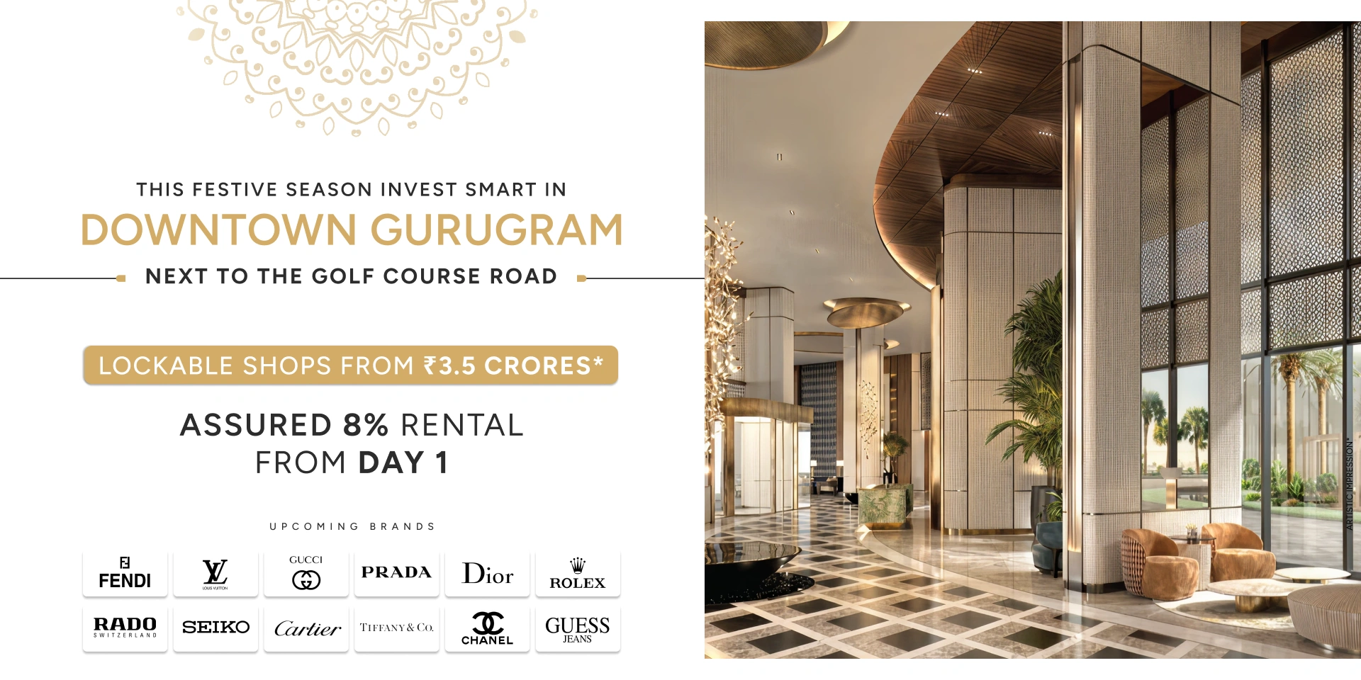 All information, images and visuals, designs and drawings, plans or sketches are only representative, an architect's impression or artistic renderings and not to scale. Interior and Accessories shown in the Show Apartment are illustrative and indicative only. Areas and land outside the periphery/ boundary of the Project are indicative and no right is created thereon. Nothing contained herein intends to constitute a legal offer and does not form part of any legally binding agreement. Recipients/ viewers are advised to exercise their discretion in relying on the information provided and are requested to verify all the details, specifications, including common areas, landscapes, amenities and facilities, services, payment plans and other relevant terms independently with the Promoter, have thorough understanding of the same and take appropriate advice prior to concluding any decision for buying in the Project. Registration No. Coming Soon available at . For more information please visit - Project address - Gurugram. Terms and conditions apply.